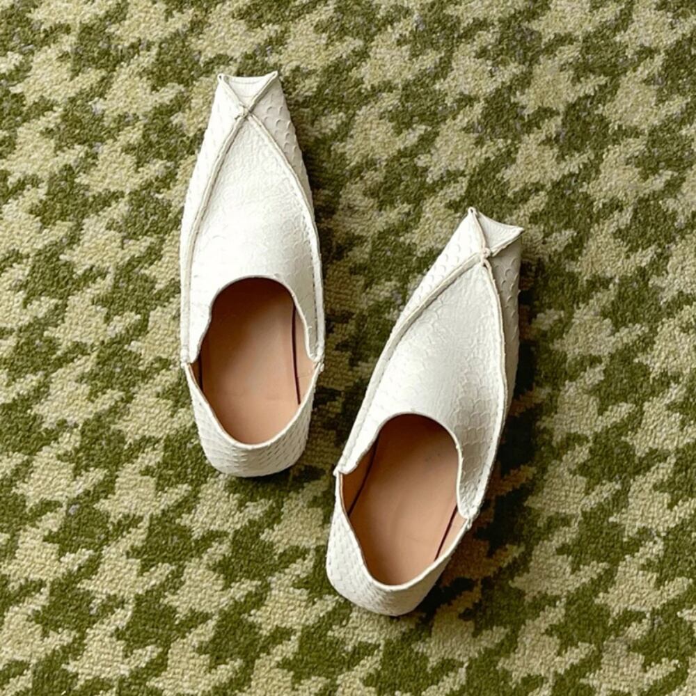 シンプルでモダンなデザインが魅力のスクエアトゥソフトバブーシュ♪